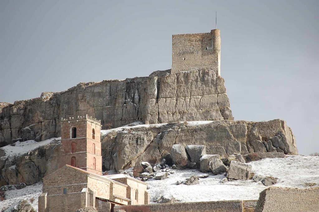 Vista del castillo y de la iglesia de Santa María del Rey tras una nevada. Foto: José Ibañez from Madrid, España. CC BY-SA 2.0. Original file (3,008 × 2,000 pixels, file size: 2.47 MB).