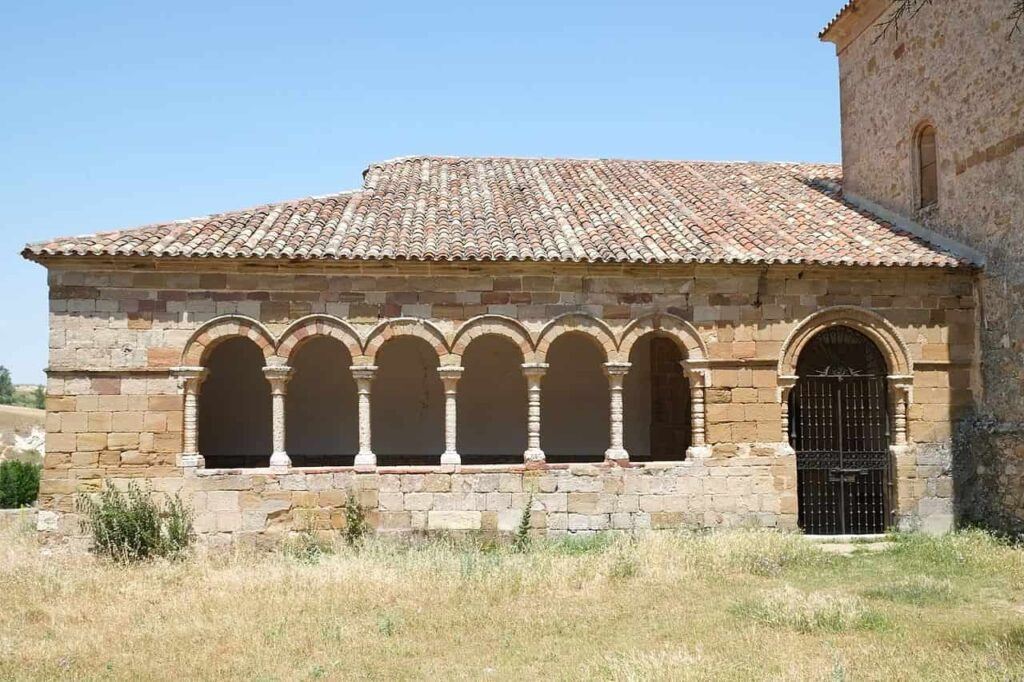 Arquitectónicamente, destaca por su sobriedad y la belleza de sus formas románicas, con elementos decorativos que reflejan la influencia de los talleres medievales que trabajaron en la región. Su fachada principal está presidida por una portada con arquivoltas decoradas y capiteles esculpidos con motivos vegetales y escenas bíblicas. El acceso está flanqueado por columnas que sostienen estas arquivoltas, en un diseño típico del románico rural castellano.