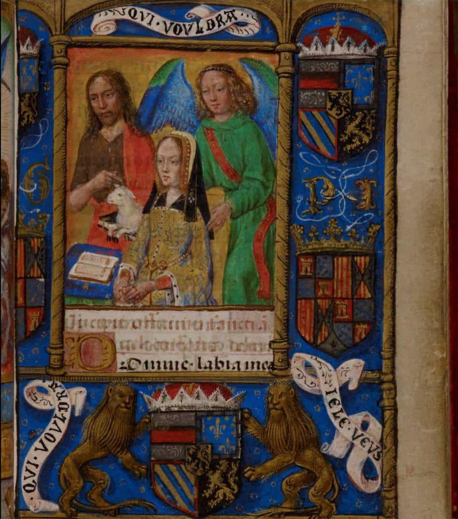 Este es el único libro de horas del que se sabe con certeza que perteneció a Juana I de Castilla, y dicha atribución se acredita triplemente de la siguiente manera: En el fol. 26 se exhiben los escudos de armas vigentes desde la celebración del matrimonio en 1496, con la corona de oro en el caso de la reina de Castilla y sobre la birreta germánica la corona del Habsburgo Felipe el Hermoso, cuyo escudo se compone de la faja de plata austríaca y los colores borgoñones, bajo el pequeño escudo en forma de corazón del centro, con el león rampante de Flandes. Las iniciales P e I, por Felipe y Juana, van entrelazadas en un lazo de amor. Dos divisas enuncian una pregunta y ofrecen una respuesta, pues por dos veces se pregunta QUI VOULDRA, esto es ¿quién querrá? – y se responde una sola vez: IE LE VEUS, ¡yo quiero!. Respecto a la fidelidad del retrato de la orante; conocemos sus rasgos a través de varios retratos de pintores flamencos de hacia 1500 y la idealizada representación en la tumba de su suegro, el emperador Maximiliano, en la Hofkirche de Innsbruck. La identidad de Juana en las Muy Ricas Horas queda documentada porque no sólo la está presentando su ángel de la guarda, sino también Juan Bautista, que fue elegido desde que la bautizaron como su santo patrón. En tercer lugar, la acreditada correspondencia con el manuscrito de una de las entradas del inventario de bienes de Juana, redactado en 1545. Allí se describe como: otro libro chiquito de paramino de mano mediano de muchas ystorias e iluminaciones, la primera ystoria es de como pecaron adan y heba y fueron hechados de paraíso comiença especulum conciencia e tiene las coberturas de terciopelo carmesí…