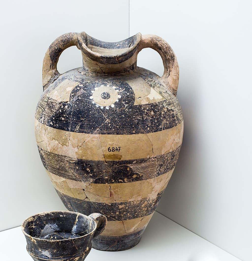 Ánfora minoica de cerámica (arcilla) con forma característica del estilo Kamares. Presenta una decoración realizada con pintura blanca sobre un engobe oscuro que cubre zonas definidas del vaso. Corresponde al estilo Kamares y data del periodo Minoico Medio IIB, dentro de la fase protopalacial. Fue hallada en el este de Creta, posiblemente en Zakros o Palaiokastro. – museum / inventory number: Siteia, Archaeological Museum 6847 – Please note: The above museum permits photography of its exhibits for private, educational, scientific, non-commercial purposes. If you intend to use the photo for any commercial aim, please contact the museum and ask for permission. ArchaiOptix – Own work. CC BY-SA 4.0. Original file (3,648 × 3,777 pixels, file size: 7.11 MB).