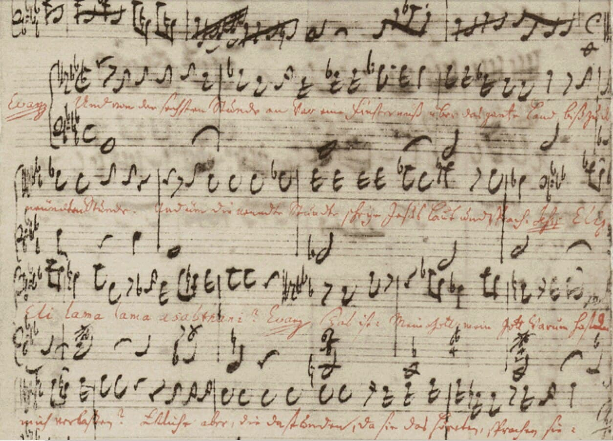 Autógrafo de Bach del recitativo con el texto del evangelio de la muerte de Cristo de la Pasión de San Mateo. (Mateo 27: 45-47a). Dominio Público.