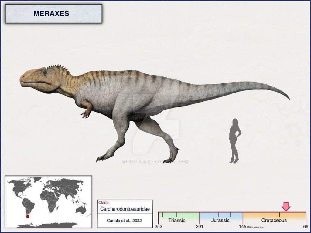 El Meraxes gigas es un hallazgo relativamente reciente y muy importante dentro de la paleontología, ya que amplía nuestro conocimiento sobre los carcharodontosáuridos, un grupo de grandes terópodos carnívoros que dominaron varios ecosistemas durante el Cretácico. Fue descrito en 2022 a partir de un esqueleto parcial hallado en la Formación Huincul de Neuquén, Patagonia argentina, un yacimiento famoso por sus dinosaurios gigantes.