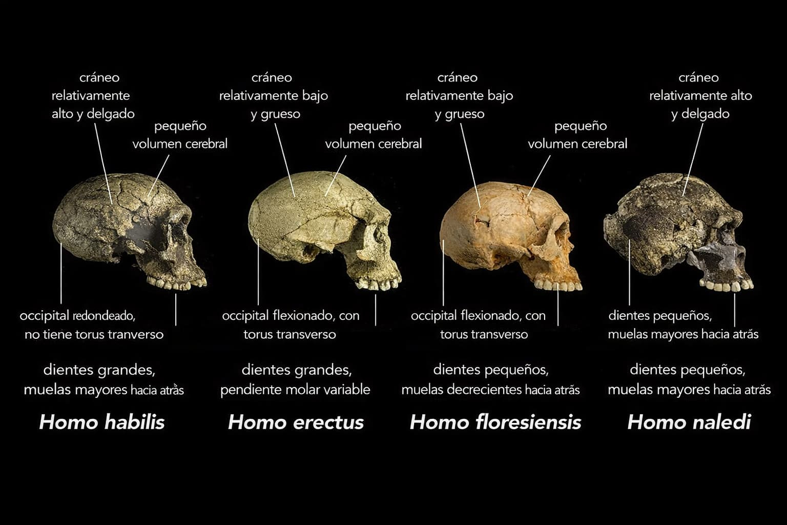 Se comparan réplicas de cráneos de (de izquierda a derecha) Homo habilis (KNM-ER 1813, Koobi Fora, Kenia, aproximadamente 1.8 millones de años), un Homo erectus temprano (D2700, Dmanisi, Georgia, aproximadamente 1.8 millones de años) y Homo floresiensis (Liang Bua 1, Indonesia, aproximadamente 20,000 años) con fragmentos reales de material craneal de Homo naledi que se han superpuesto en una reconstrucción virtual (extremo derecho; observe que algunas de las imágenes del material de H. naledi han sido invertidas). En cada caso, los cráneos están etiquetados con las características típicas de cada especie. Por ejemplo, mientras que el volumen cerebral de los humanos modernos (Homo sapiens) adultos es típicamente entre 1000 y 1500 centímetros cúbicos (cc), H. habilis variaba de aproximadamente 510 a >700 cc, H. erectus de aproximadamente 550 a >1100 cc, H. floresiensis alrededor de 426 cc, y H. naledi entre 466 y 560 cc. Además, en los humanos modernos, el hueso occipital (en la parte posterior del cráneo) típicamente tiene una forma redondeada en el perfil, mientras que en algunos humanos primitivos como H. erectus, las porciones superior e inferior del occipital están anguladas entre sí (es decir, «flexionadas»), y hay una cresta ósea pronunciada que atraviesa la región angulada (llamada toro transversal).