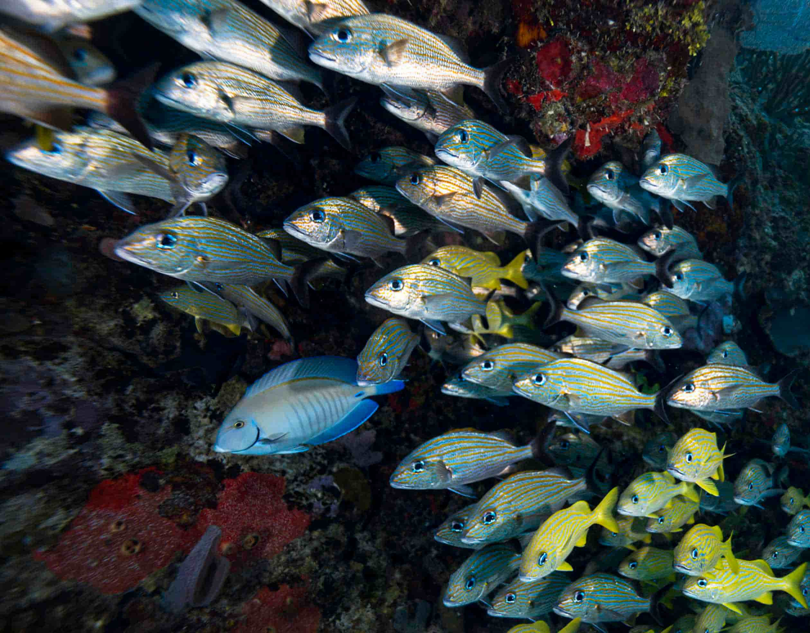 Banco de peces entre corales tropicales. La imagen muestra un denso grupo de peces tropicales desplazándose entre cavidades rocosas, corales y fondos submarinos de gran riqueza cromática. Las franjas amarillas y azuladas de muchos ejemplares aportan dinamismo y ritmo visual a la escena, mientras otros peces de tonos más suaves amplían la variedad del conjunto. Todo el encuadre transmite movimiento, densidad y vida, como si el arrecife respirara a través de la actividad incesante de sus habitantes. Este tipo de concentración de peces es característica de los ecosistemas coralinos, donde la abundancia de refugios, alimento y protección favorece una biodiversidad extraordinaria. La fotografía no solo destaca por su belleza, sino también por mostrar la complejidad y vitalidad del mundo submarino.