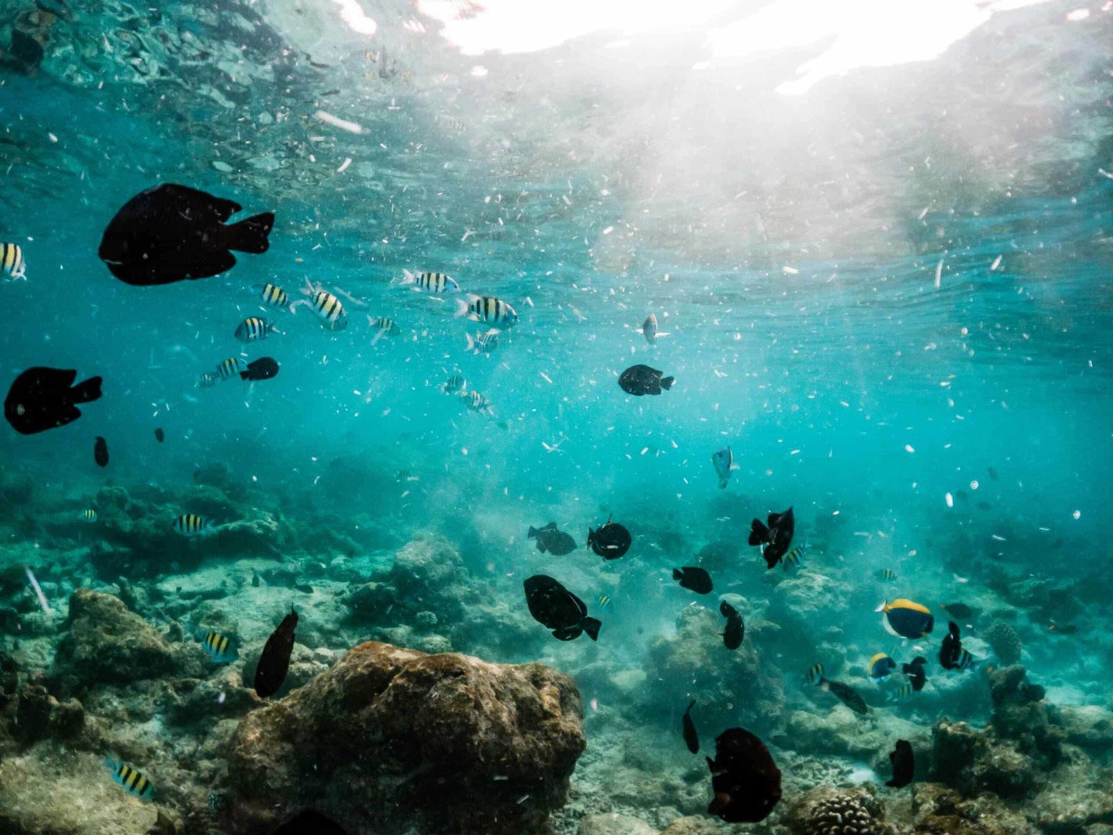 Se muestra un paisaje submarino de aguas claras y luminosas donde pequeños peces tropicales se desplazan entre rocas y corales, suspendidos en un mundo de tonos azules y reflejos cambiantes. La luz del sol, filtrada a través de la superficie, crea una atmósfera vibrante y casi transparente, llena de movimiento y profundidad. Entre los peces destacan siluetas oscuras y ejemplares rayados, que aportan variedad y ritmo a la escena. Más allá de su belleza visual, este entorno recuerda la extraordinaria riqueza de los ecosistemas marinos y la fragilidad de los arrecifes, espacios esenciales para la biodiversidad oceánica y para el equilibrio del planeta.
