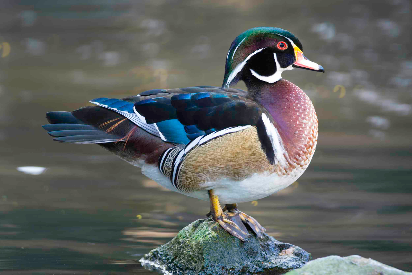 Las dos imágenes muestran un macho de pato joyuyo o pato de Carolina, una especie fácilmente reconocible por el extraordinario colorido de su plumaje. La cabeza presenta irisaciones verdes y azuladas, recorridas por finas líneas blancas que perfilan el ojo y el cuello; el pico, rojizo y amarillento, y el ojo rojo intenso refuerzan todavía más su aspecto llamativo. El pecho, de tonos castaños salpicados de pequeñas manchas blancas, contrasta con los flancos claros y las alas oscuras con reflejos metálicos. En la primera fotografía, el ave aparece flotando con serenidad en el agua; en la segunda, posada sobre una roca, permite apreciar mejor la forma del cuerpo y la elegancia del plumaje. La hembra, por el contrario, es bastante más discreta, de tonos pardos y con un anillo blanco alrededor del ojo, lo que constituye un ejemplo de claro dimorfismo sexual.