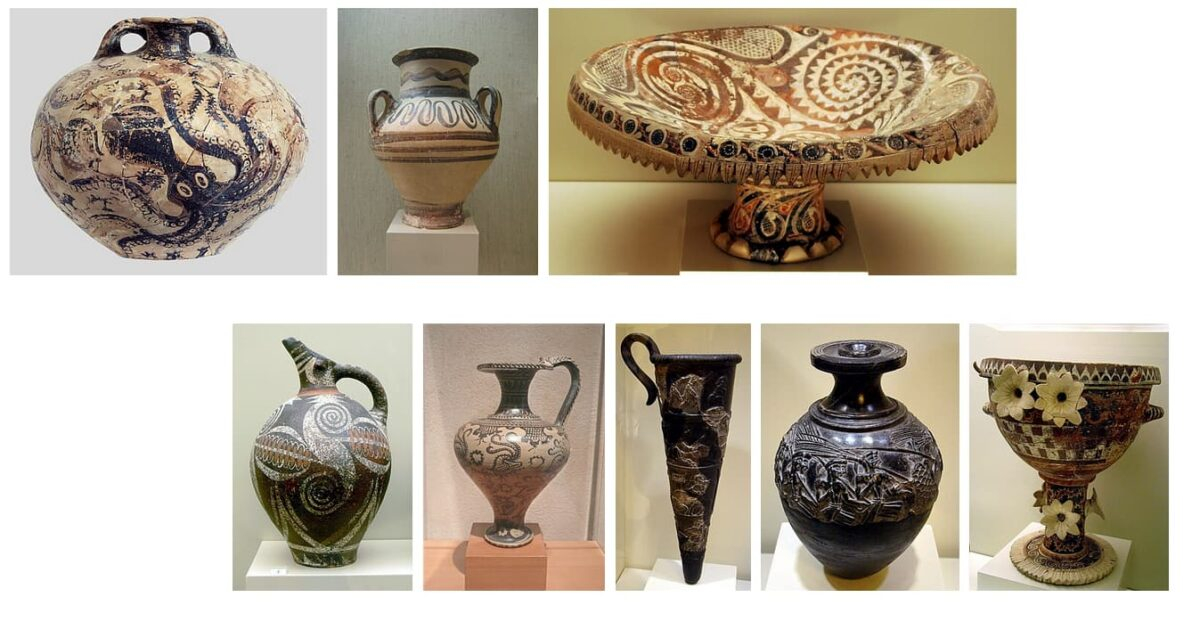 - Kamares: Vasijas finas y ligeras con decoraciones en colores vivos sobre fondo oscuro, típicas del Periodo Protopalacial.