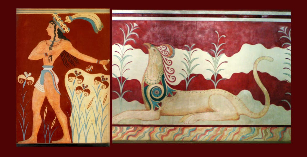 Foto de entrada (izq), «El principe de los lirios, de Cnosos. Foto: Harrieta171. Foto derecha: Grifo, de Cnosos. Foto: Karl432 y Paginazero. Ambas CC BY-SA 3.0.