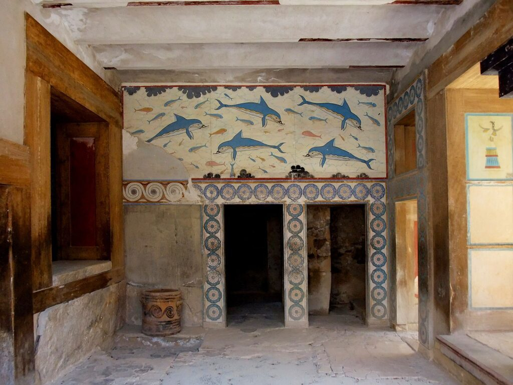 Fresco de los Delfines, en el megaron de la Reina. Palacio de Cnosos. 1500 a. C. Foto: Arne Nordmann (norro), Germany. CC BY-SA 3.0. Original file (1,024 × 768 pixels, file size: 209 KB).