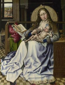 La escena sacra se integra en un interior profano, una novedad del arte flamenco contemporáneo que buscando el verismo abandonó los fondos dorados, las aureolas, la planitud y la perspectiva jerárquica del arte medieval. No obstante, el realismo con el cual el interior es plasmado en torno a la Virgen no excluye el recordatorio de conceptos religiosos ni la presencia de símbolos. El libro de oraciones abierto detrás alude a la Anunciación. Los leones tallados sobre el reposabrazos del banco recuerdan el Trono de Salomón, como es descrito en el primer libro de los Reyes. Incluso el taburete triangular probablemente aluda a la Trinidad (Padre, Hijo y Espíritu Santo) o al ciclo del Tiempo: Pasado, la esquina en sombra, Presente, la esquina iluminada, y Futuro, la esquina ocultada por el banco. La materialidad casi excesiva de las carnes y las telas, así como un cierto volumen de la composición, son características de la obra madura del pintor.