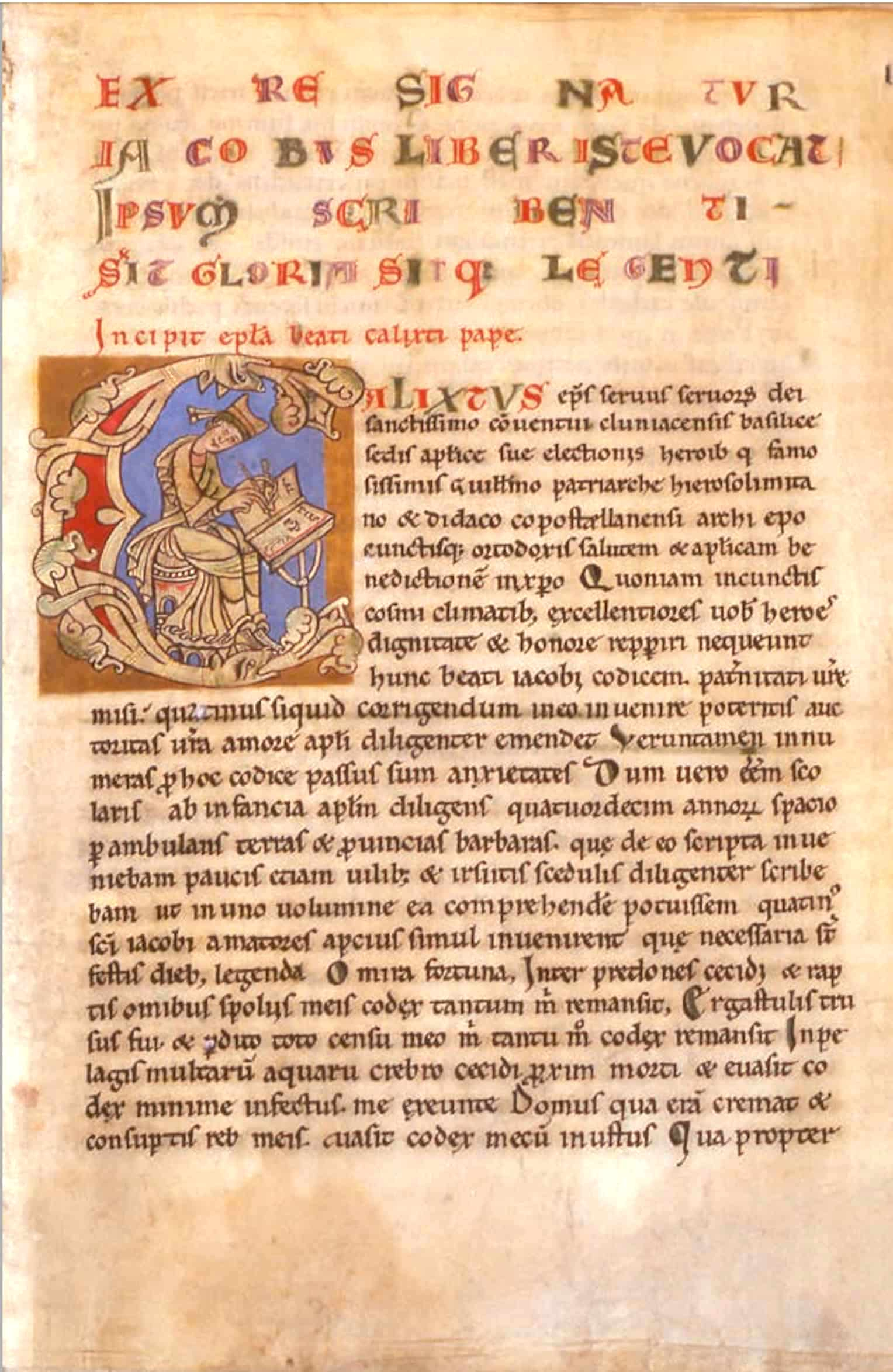 En este contexto nace el Liber Sancti Iacobi, del cual el Códice Calixtino es la copia más conocida y conservada. Se trata de una compilación realizada hacia 1140, que reúne sermones, himnos litúrgicos, milagros, leyendas, textos hagiográficos y una guía práctica para los peregrinos que viajaban a Compostela. Aunque la obra se presenta bajo el nombre del papa Calixto II (de ahí su nombre «Calixtino»), esta atribución es simbólica y forma parte de una estrategia de autoridad textual habitual en la época. El verdadero impulsor de la obra fue probablemente el clérigo francés Aymeric Picaud, figura erudita y viajero, a quien se atribuye, entre otras cosas, la redacción del famoso Liber Peregrinationis, o Guía del peregrino, quinto libro del códice.