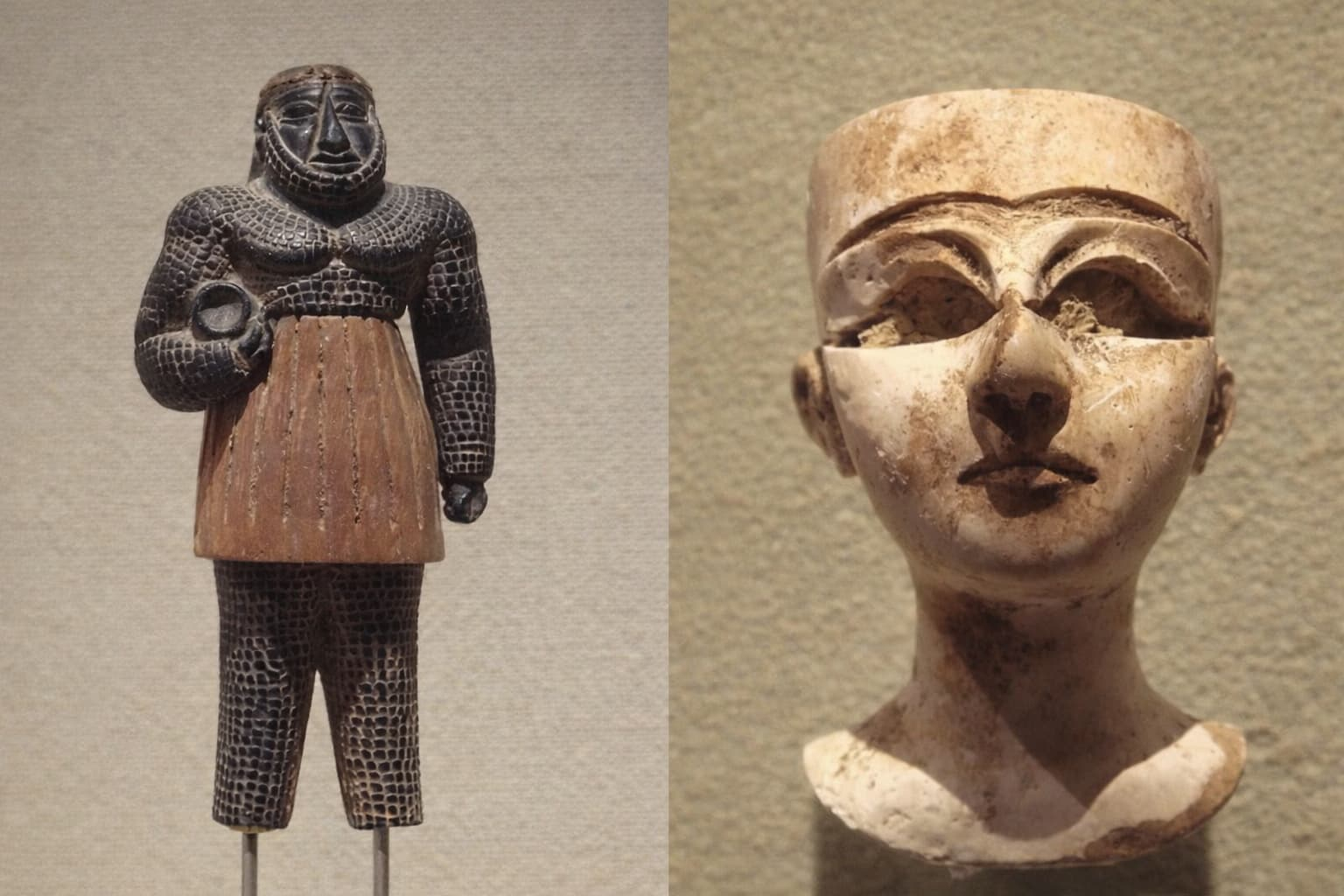 Foto izq. Monstruo bactrio con trompeta. (?). PHGCOM – self-made, photographed at the MET, 2006. CC BY-SA 4.0. Datación entre 3 y 2 milenio a.C. Foto Derecha: Cabeza de mujer de la cultura bactrio-marguiana (entre el 2100 y el 1700 a. C.). PHGCOM – self-made, photographed at the MET, 2006.