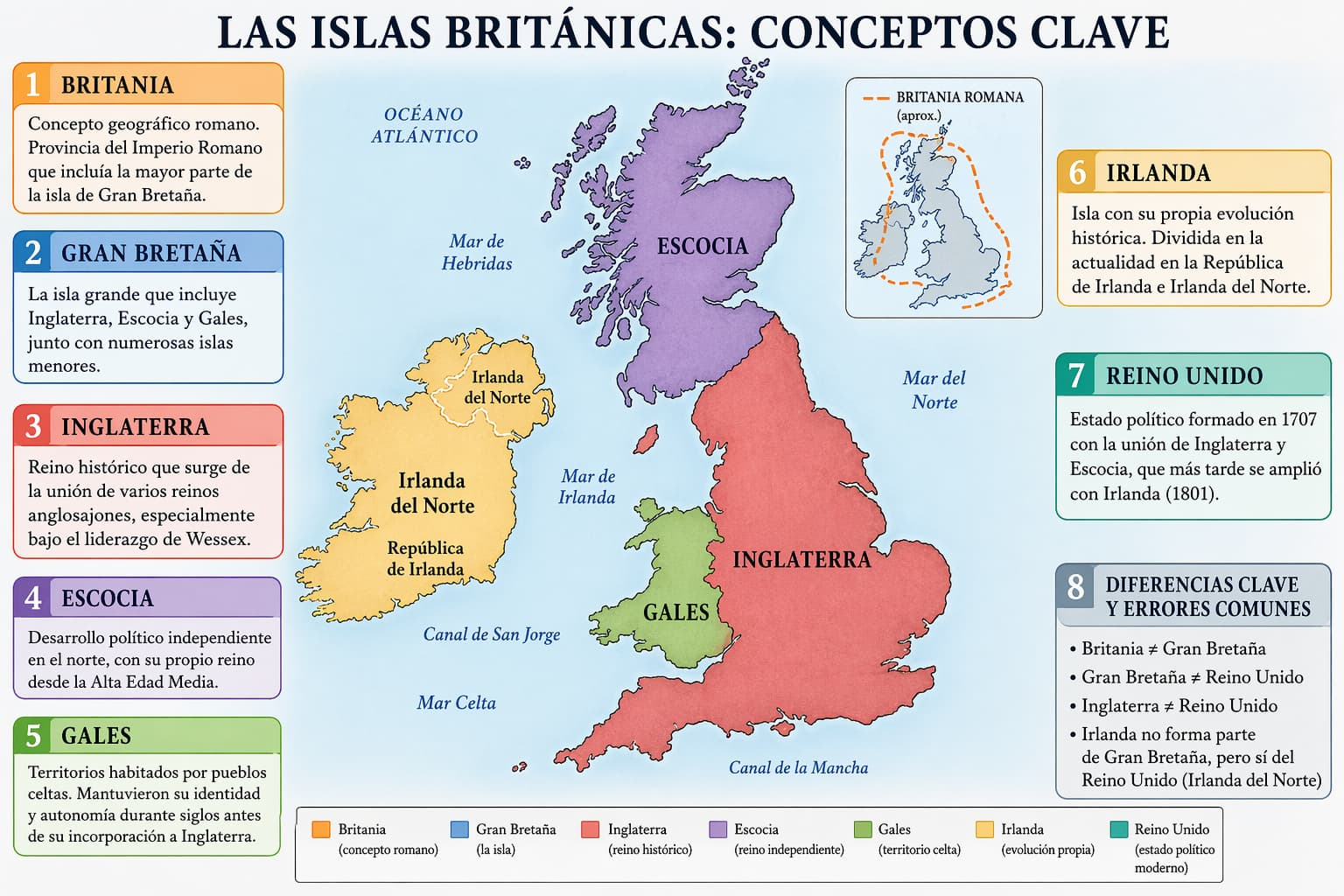 Por eso, para entender bien la historia, conviene usar cada nombre con cuidado. Britania remite sobre todo al marco romano y antiguo; Gran Bretaña designa la isla principal; Inglaterra es un reino histórico concreto surgido en el sur y centro de esa isla; Escocia, Gales e Irlanda tienen trayectorias propias; y el Reino Unido pertenece a una fase política mucho más tardía. Tener claras estas diferencias no es una cuestión menor de vocabulario: es una forma de pensar con orden y de no proyectar sobre el pasado las divisiones políticas del presente.