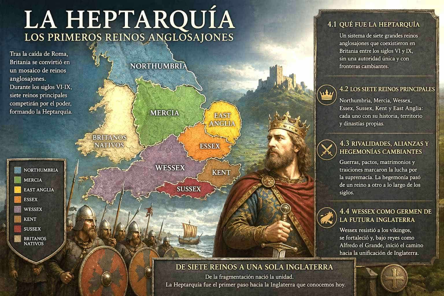 La isla medieval nació así de una transformación profunda, no de una continuidad simple. En ella convivieron ruinas del mundo romano, herencias celtas, aportaciones germánicas y, más adelante, nuevas influencias cristianas y escandinavas. Todo lo que vendrá después —la Heptarquía, la cristianización, los vikingos y la unificación inglesa— solo puede entenderse bien si se parte de este primer gran cuadro: el de una isla que estaba dejando de ser una cosa para convertirse en otra.