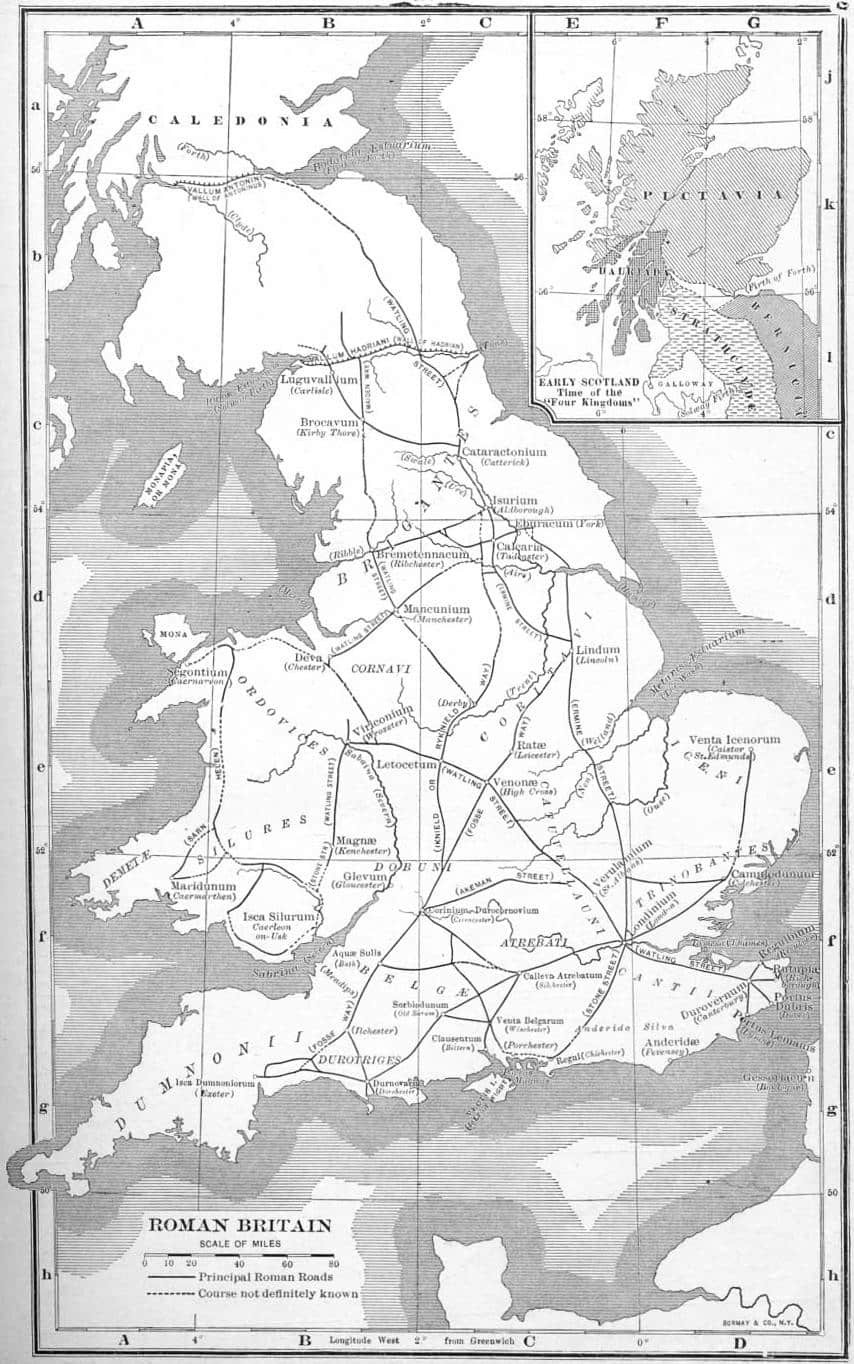 Principales asentamientos y calzadas de Britania. Earle W. Dowe; uploaded to English Wikipedia 22:04, 1 April 2005 by Adamsan – Atlas of European History, London: G. Bell & Sons, 1910. Dominio Público.