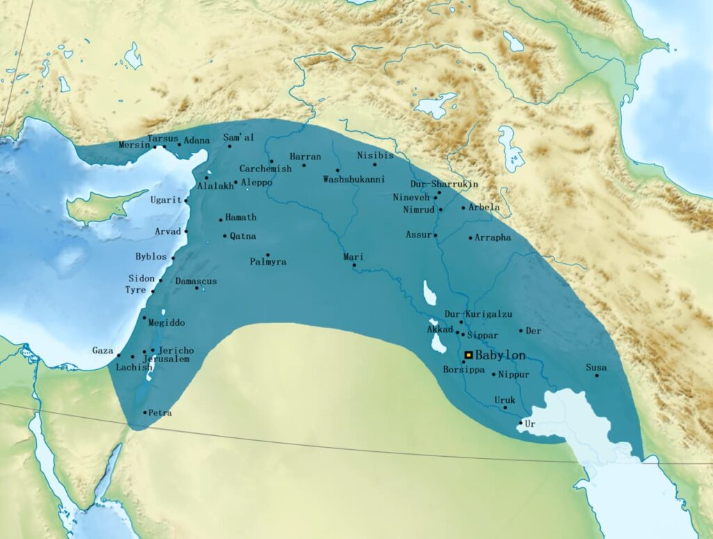 Babilonia bajo Hammurabi. Mapa de la Babilonia de Hammurabi, mostrando el territorio entre su ascenso en 1792 a. C. y su muerte en 1750 a. C. La linea de costa y los cursos de los ríos son los de ese período. El norte se encuentra en su posición usual. Existen algunas dudas sobre si las ciudades de Nínive, Tttul y Asur estuvieron bajo la autoridad babilona. Mientras que en la introducción del «código de Hammurabi» se asegura su posesión, Roaf no incluye ninguna de ellas, en cuyo mapa está basado éste. Crates – Translation of File:Hammurabi’s Babylonia 1.svg. CC BY-SA 4.0.