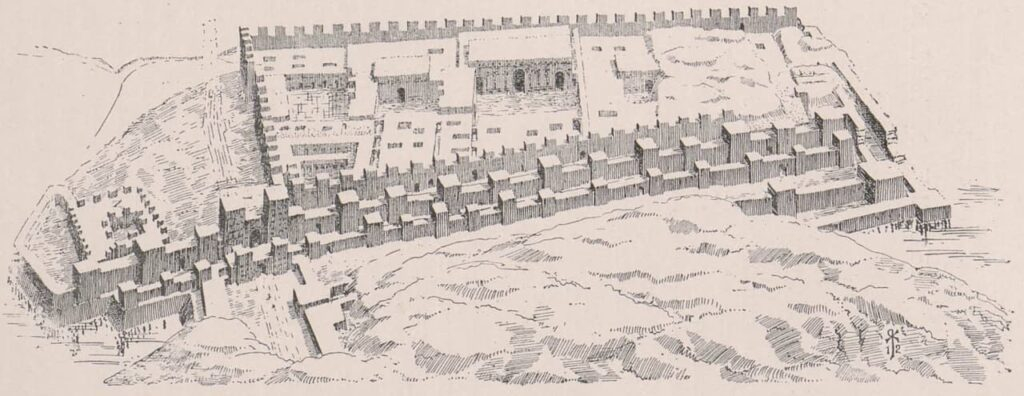 «Dibujo hipotético de la Fortaleza del Sur (Südburg) de Babilonia, palacio construido por Nabucodonosor II, por Robert Koldewey.» Foto: Robert Koldewey (1855-1925) – R. Koldewey, Das wiedererstehende Babylon, Leipzig, 1913, p. 66.. Public Domain. Original file (1,315 × 509 pixels, file size: 1.08 MB.