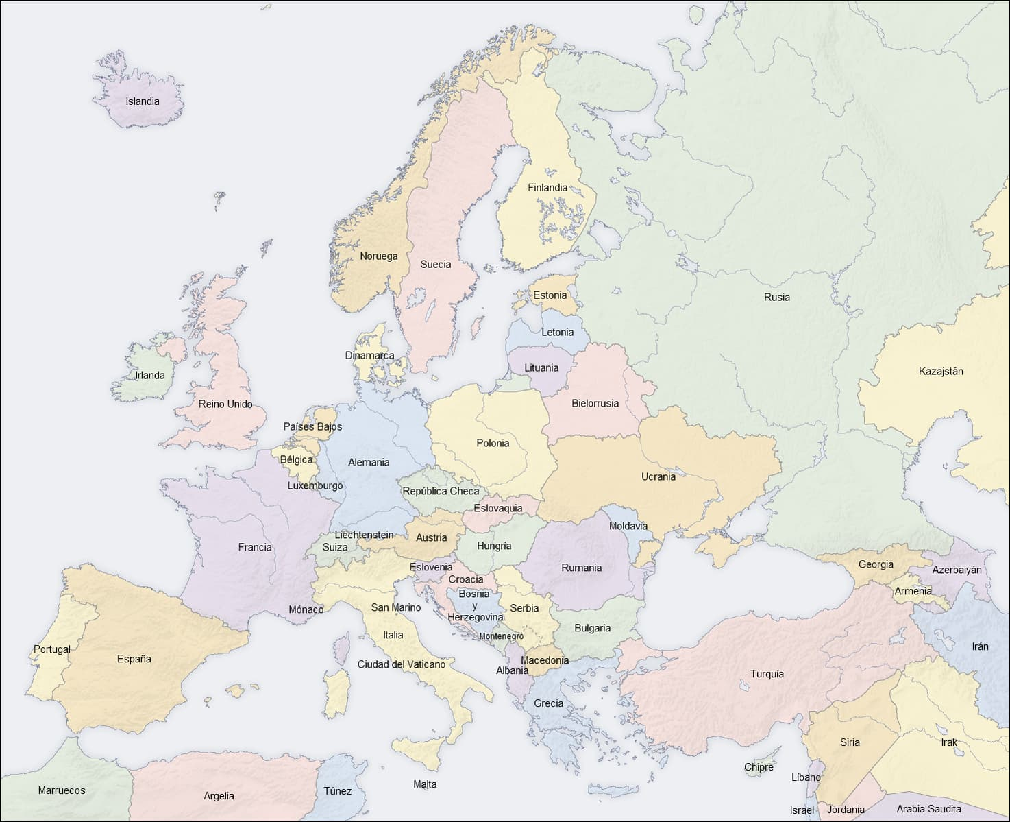🗺️ Relieve físico de Europa. El mapa muestra la topografía europea mediante una escala de colores que representa la altitud: el verde corresponde a las tierras bajas y llanuras, el amarillo indica zonas de altitud media y el marrón señala las áreas montañosas y de mayor elevación. Se aprecia claramente la gran extensión de la llanura europea, que abarca desde el norte de Francia y Alemania hasta Rusia occidental, configurando una de las áreas más extensas y continuas de terreno llano del mundo.