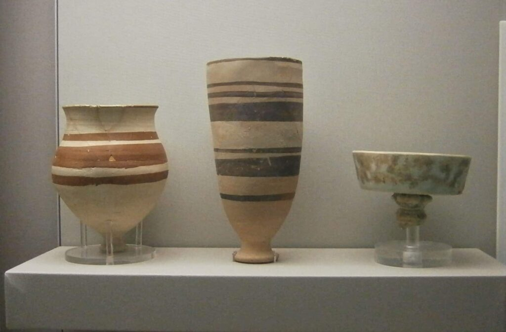 Izquierda: fino vaso de bebida pintado, de Assur; centro: fino vaso de bebida pintado, de Tell Brak.; derecha: cuenco con pedestal de loza, de Tell Rimah. Autor: Zunkir . CC BY-SA 4.0.