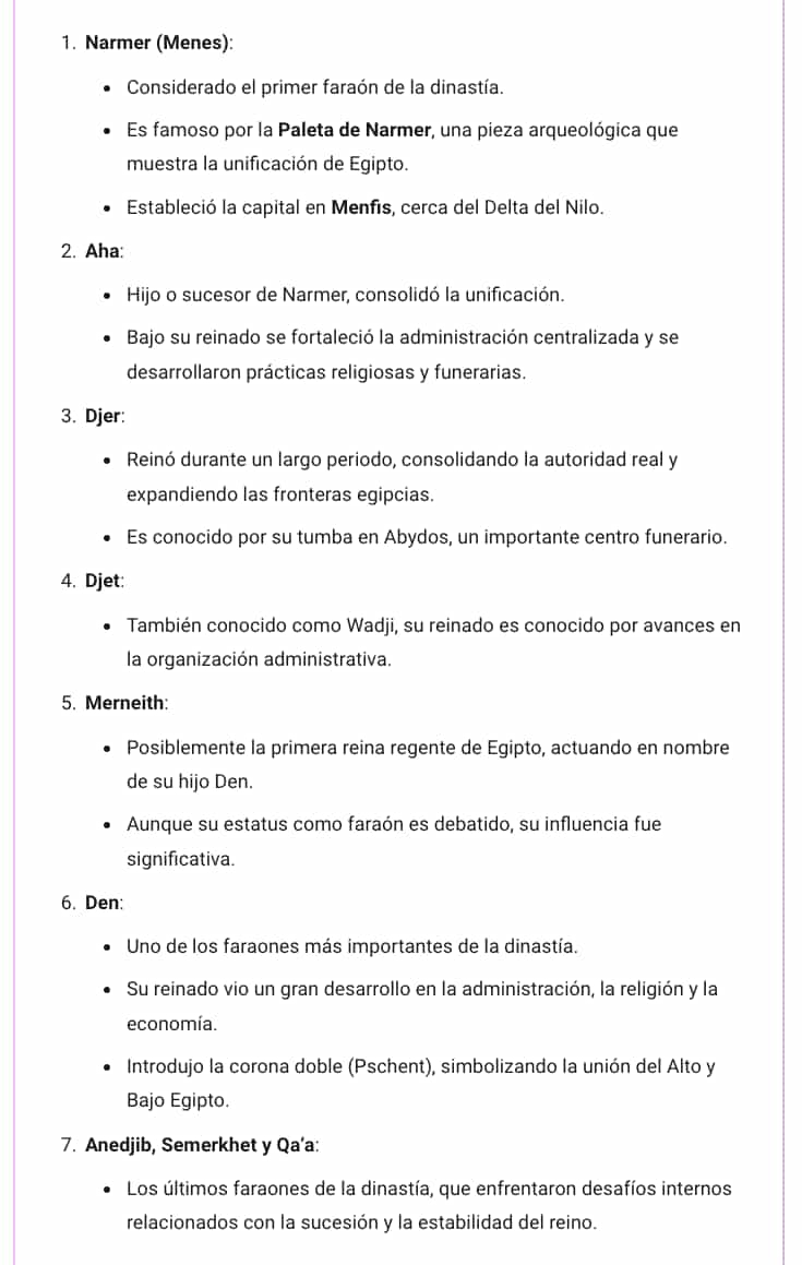 Organización Política y Social: Se desarrollaron estructuras gubernamentales centralizadas, con una fuerte figura del faraón como líder político y religioso. Se consolidaron las ciudades principales como Tinis, Menfis y Hieracómpolis.