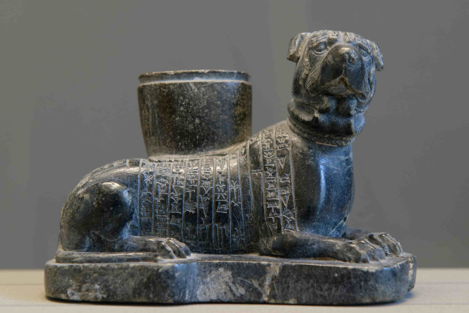 Figurilla votiva de un perro en esteatita, ofrecido por un médico de Lagash a la diosa Nisina, en beneficio de Sumu-ilum, rey de Larsa (c. 1894-1865 a. C.) Procede de Ngirsu. Marie-Lan Nguyen y un autor más. CC BY 2.5. Original file (5,000 × 3,337 pixels, file size: 11.6 MB).