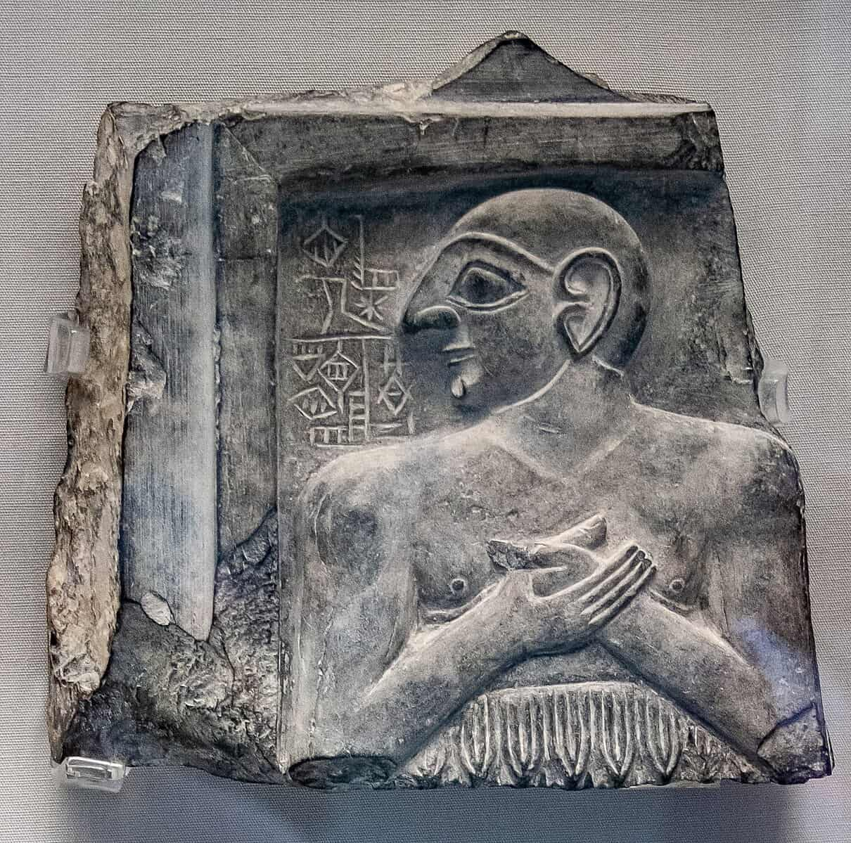 Enannatum I, ruler of Lagash. From Girsu. The iscription records his name. The plaque was probably fixes to the wall of a temple of a shrine. Unknown artist – Own work, Photo by Szilas in the British Museum, 2010-08-03. CC BY-SA 4.0. Original file (1,801 × 1,785 pixels, file size: 2.63 MB).