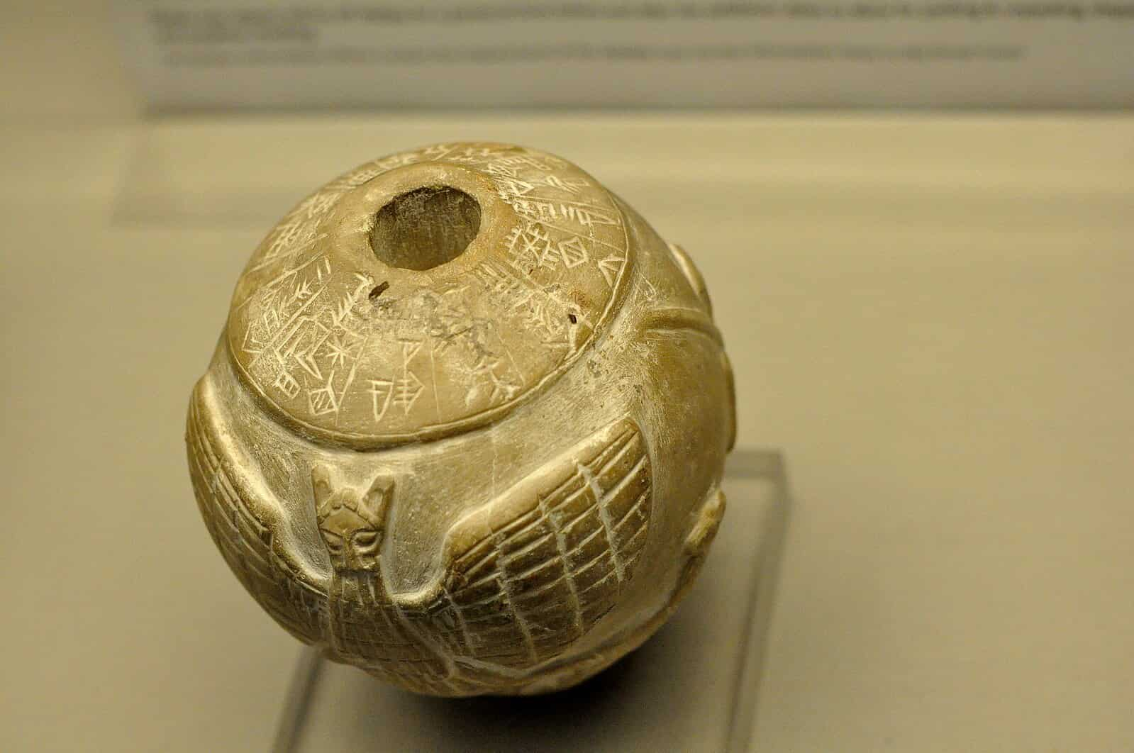 Cabeza de maza dedicada al dios Ningirsu. En la maza, Imdugud, el águila con cabeza de león, sujeta un par de leones. Hay tres figuras humanas en los lados y la parte trasera de la cabeza de la maza. La figura más grande probablemente representa a Enannatum, rey de Lagash. Procedente de Girsu (actual Tell Telloh, Gobernación de Dhi Qar), en el sur de Mesopotamia, Irak. Hacia 2400 a.C., período dinástico temprano III. Museo Británico, Londres. Osama Shukir Muhammed Amin FRCP(Glasg). CC BY-SA 4.0. Original file (4,288 × 2,848 pixels, file size: 6.88 MB).