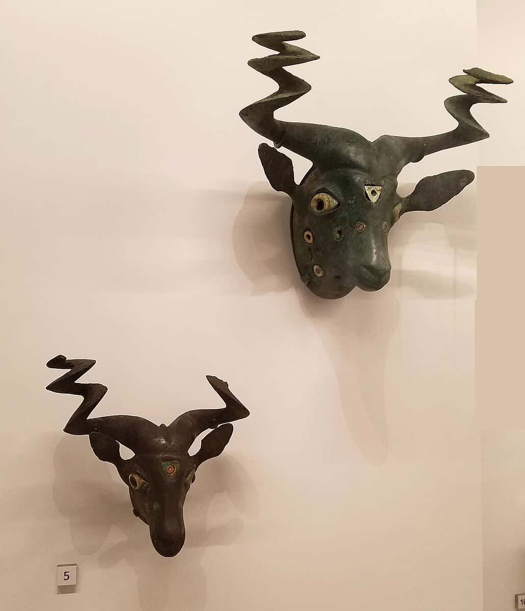 Aleación de cobre, concha, piedra caliza, ca. 2475-2300 a.C., posiblemente de Fara (Irak). De la exposición: «Estas cabezas fueron fundidas en cobre e incrustadas con concha y piedra caliza coloreada. Los poderosos cuernos en forma de sacacorchos capturan la majestuosidad de un markhor, una cabra montés salvaje.» Utopian100. CC BY-SA 4.0. Original file (3,095 × 3,600 pixels, file size: 2.17 MB).
