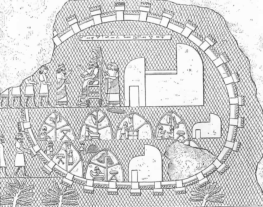 Grabado de principios del siglo XX que reconstruye un relieve de Nimrud con una ciudad amurallada en la que se representan (con la misma forma, sólo diferenciados por el tamaño) un palacio o templo y distintas viviendas y talleres artesanales. Scan by ru:user:Кучумов Андрей – Scanned from book Всемирная история (в четырёх томах) Древний мир. Сочинение профессора Оскара Егера(† 1910). Издательство «Специальная литература» Санкт-Петербург 1997 isbn 5-87685-085-3 (т. 1) тираж 10000. 824 стр. Reprint of 1904 year edition by А. Ф. Маркс († 1904). Plan, section and elevation of an assyrian fortified city. Drawing of the relief from Nimrud. Dominio Público.