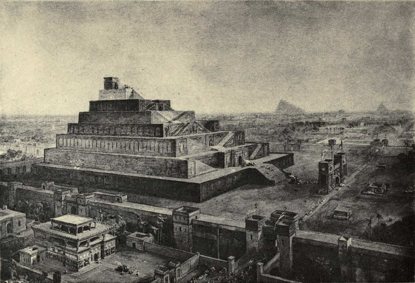 Reconstrucción arqueológica de William Douglas Simpson (1907) del templo y las murallas de Babilonia. William Simpson (1823—1899) – Horne, C. F. The sacred books and early literature of the East; with an historical survey and descriptions.The walls of Babylon and the temple of Bel. Dominio Público. Original file (2,151 × 1,464 pixels, file size: 5.6 MB).