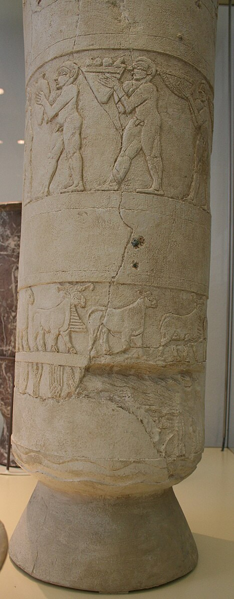 Vasija tallada procedente del templo de Eanna (la localidad precursora de la ciudad de Uruk). Periodo de Uruk (IV milenio a. C.). Einsamer Schütze – Trabajo propio. CC BY-SA 3.0. Original file (1,236 × 3,156 pixels, file size: 2.61 MB).