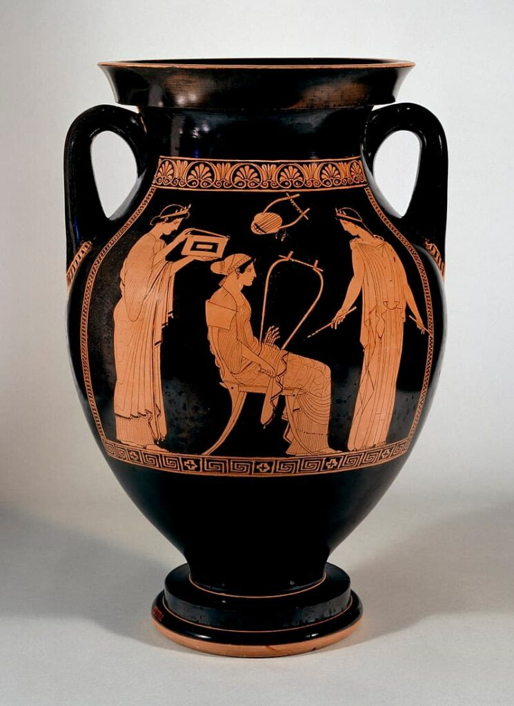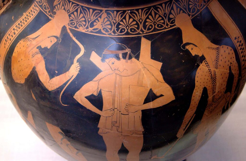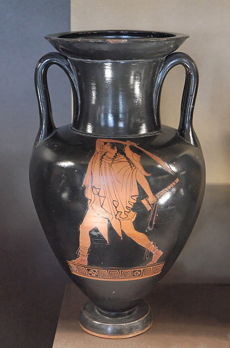 Escena de figuras rojas en el Ánfora panzuda del Pintor de Andócides (Múnich, n.º inv. 2301). Staatliche Antikensammlungen. Andócides – User:Bibi Saint-Pol, own work, 2007-02-10. Dominio Público. Original file (2,913 × 2,014 pixels, file size: 4.61 MB). Fuente: Wikimedia Commons (licencia CC BY-SA).