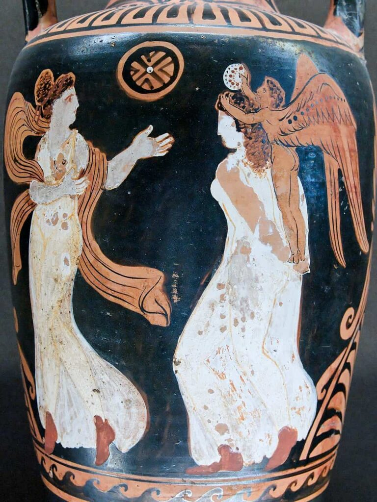 La escena representada en este vaso muestra a dos mujeres en un contexto doméstico o ritual, acompañando a un pequeño Eros alado que juega sobre una columna o altar. Las figuras femeninas, ricamente adornadas, participan en el ritual con gestos expresivos que evocan tanto la intimidad como el carácter solemne del momento. Asteas, maestro de Paestum, es conocido principalmente por sus escenas teatrales, pero también supo adaptarse a temáticas de la vida cotidiana y del mundo femenino, lo que refleja la versatilidad de su taller.