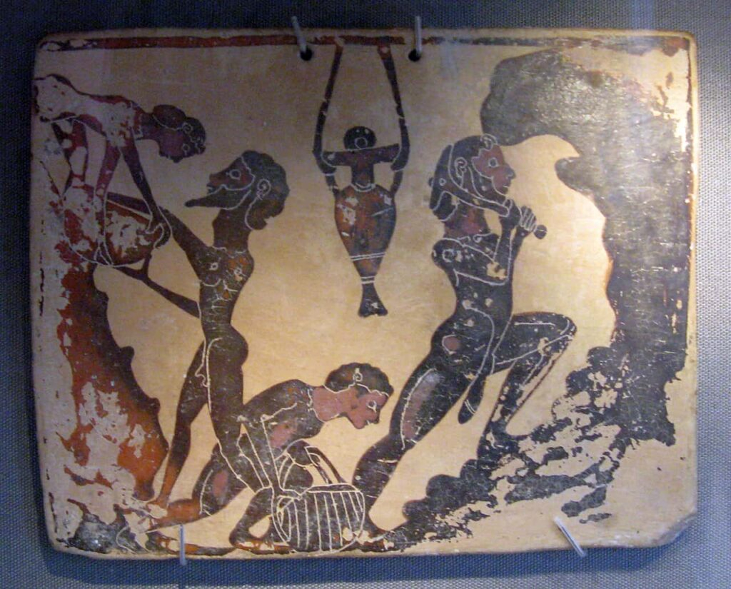 Escena de figuras negras en el Ánfora panzuda del Pintor de Andócides (n.º inv. 2301). Múnich, Staatliche Antikensammlungen. Original file (2,760 × 1,881 pixels, file size: 4.01 MB). Fuente: Wikimedia Commons (licencia CC BY-SA).