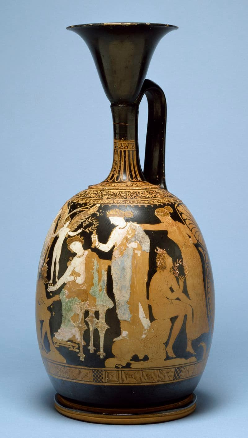 El uso de las siluetas en rojo sobre un fondo negro reproduce fielmente la estética de los vasos áticos del siglo V a. C., aunque se trata de una obra moderna, atribuida al círculo de Pierre-François Hugues d’Hancarville, anticuario y estudioso del arte clásico en el siglo XVIII. D’Hancarville fue célebre por sus publicaciones sobre cerámica griega, en especial las que documentaban la colección de Sir William Hamilton, embajador británico en Nápoles.
