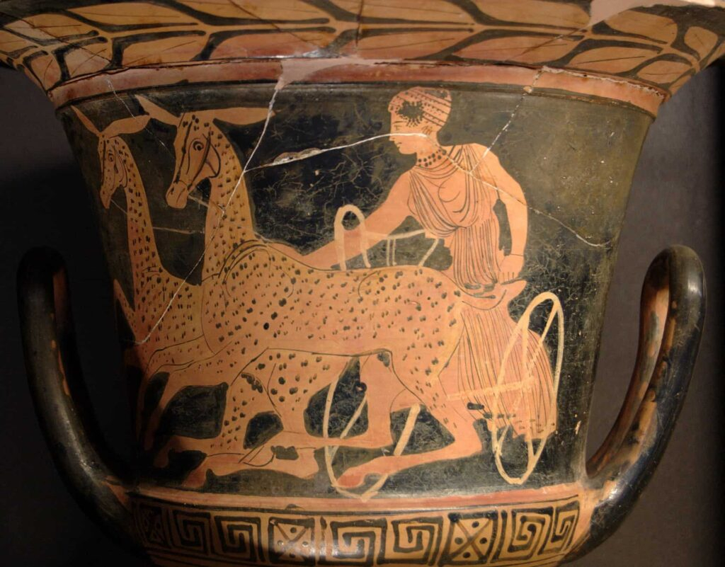 Artemisa en un carro. Cántaros del Pintor del gran cántaros de Atenas, c. 450-425 a. C. Painter of the Great Athens Kantharos – User:Bibi Saint-Pol, own work, 2007-06-15. Dominio Público. Original file (2,576 × 2,014 pixels, file size: 2.65 MB).