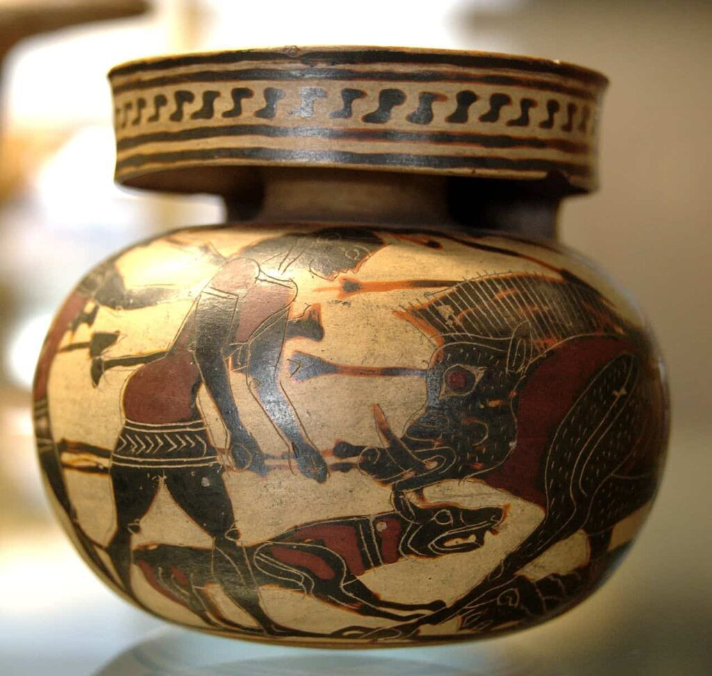 El llamado grupo de los Pioneros —Eufronio, Eutímides, Fintias, entre otros— lleva esta novedad a su madurez. Eufronio profundiza en el estudio del cuerpo en tensión y en escenas de palestra y combate; Eutímides experimenta con torsiones y posturas de tres cuartos, hasta jactarse en una inscripción de haber dibujado una figura “como nunca Eufronio”; Fintias, más sobrio, refina el dibujo lineal y el drapeado. Conviven aún rasgos arcaicos —ojos en perfil “almendrado”, cabellos punteados— con un naturalismo creciente. Mitología, sympósion y vida cotidiana se convierten en laboratorios de gesto y movimiento, y se multiplican firmas y inscripciones kalós que delatan la clientela juvenil y el orgullo profesional de talleres del Cerámico. Este período arcaico temprano deja fijado el vocabulario formal —anatomía persuasiva, narración ágil, composición clara— que hará de la cerámica ático–figural el referente del siglo V a. C. y el modelo que otros centros buscarán emular.