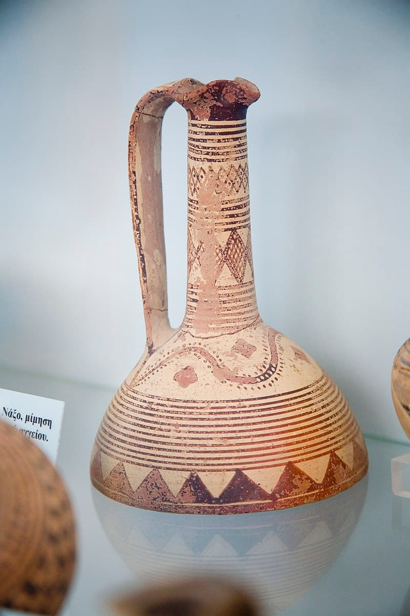 Ánforas pequeñas, empleadas para almacenar vino o aceites, algunas decoradas con motivos geométricos y bandas horizontales.