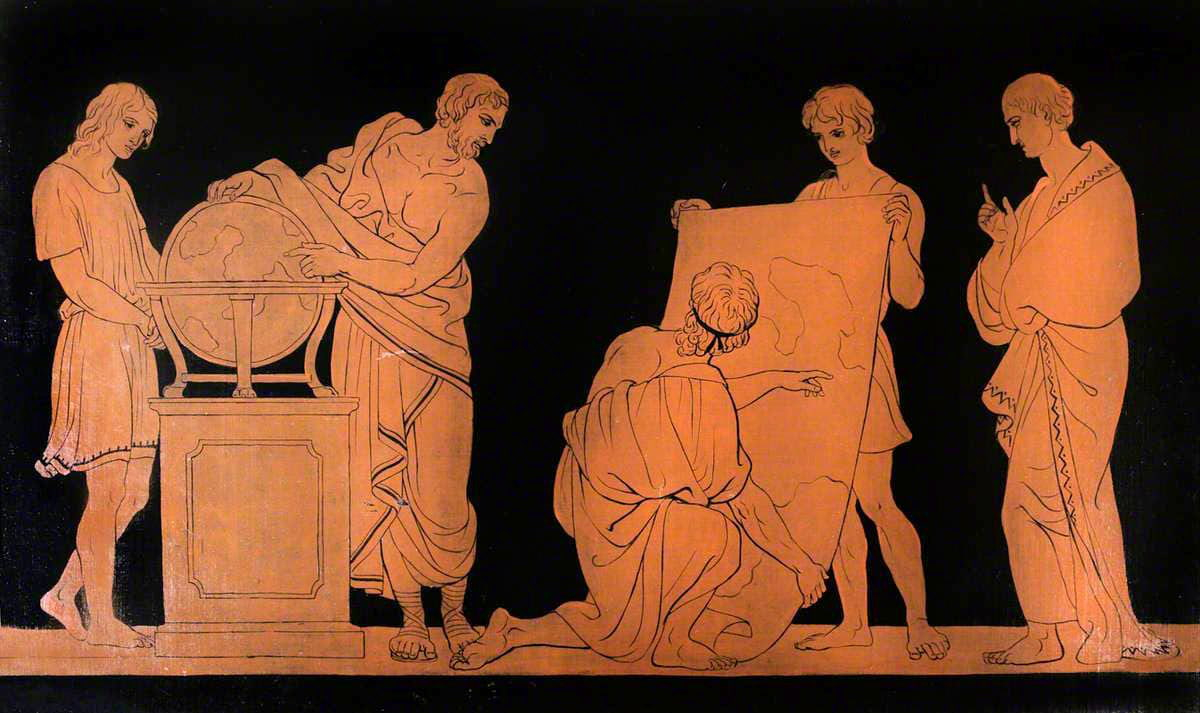 La imagen representa una escena alegórica de geógrafos de la Antigüedad, realizada en estilo que imita la cerámica griega de figuras rojas. En ella se observan cinco personajes: uno señala un globo terráqueo situado sobre un pedestal, mientras otros consultan un gran mapa desplegado. La composición sugiere el espíritu investigador de los griegos, pioneros en el estudio de la geografía, la astronomía y la cartografía.