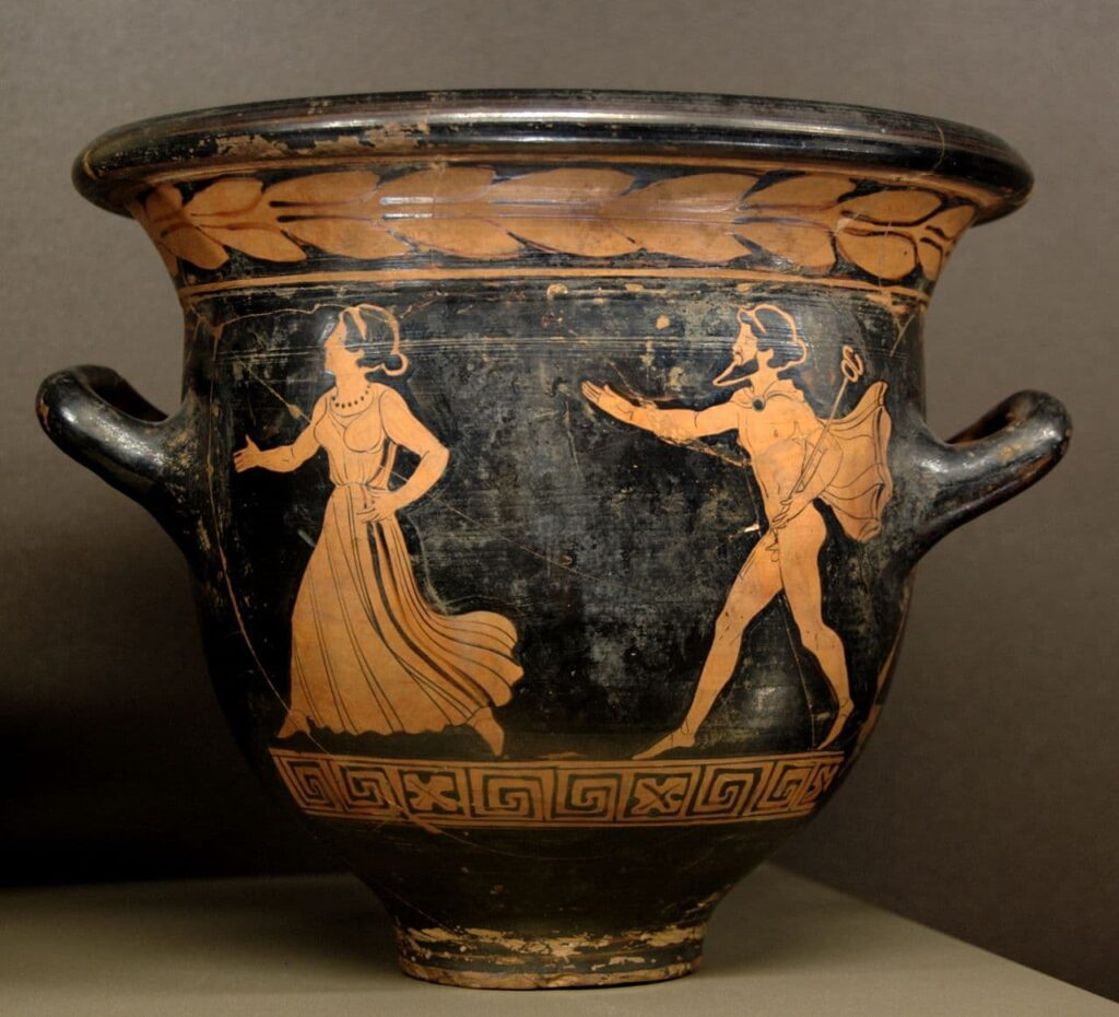 Atenea y Poseidón en una crátera de volutas del Pintor de Nazzano, c. 360 a. C. Museo del Louvre. Nazzano Painter – Marie-Lan Nguyen (2007). Dominio Público. Original file (2,550 × 3,400 pixels, file size: 4.4 MB).