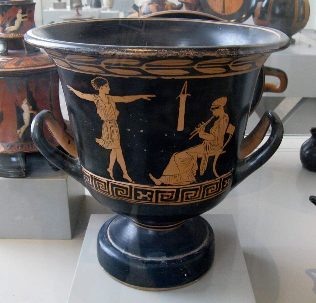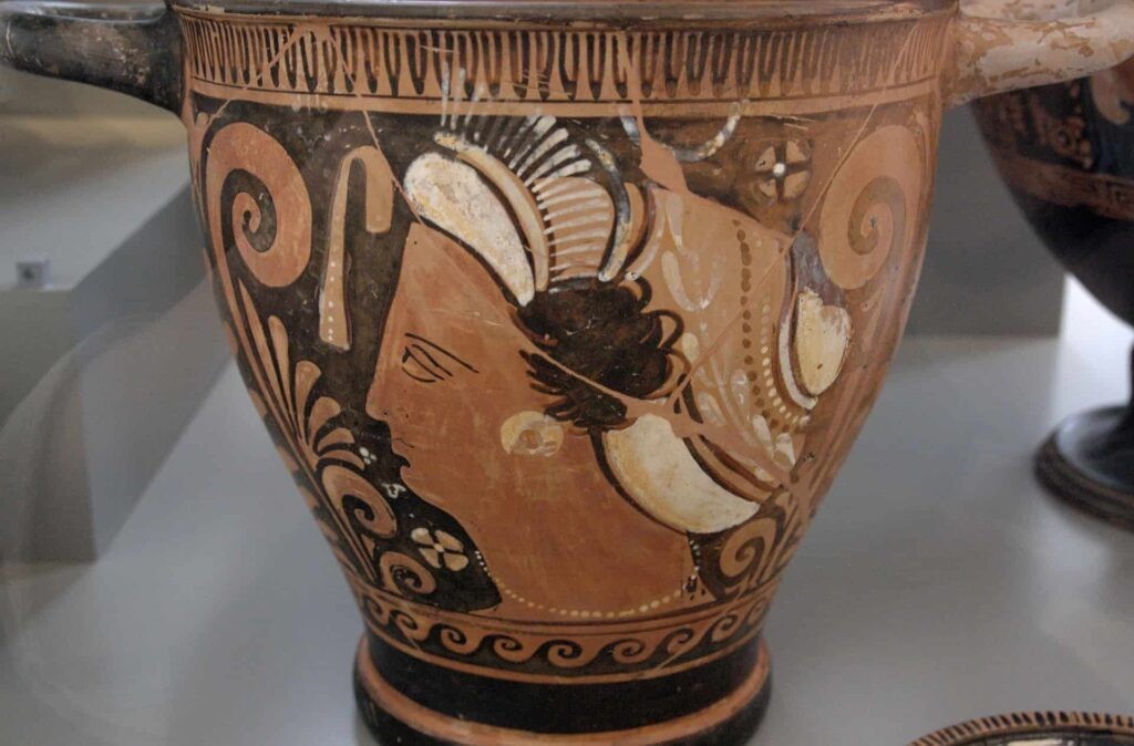 Una crátera de campana de figuras rojas, en el centro de la vitrina, que muestra una escena figurada (probablemente dionisíaca o de banquete), típica de los vasos utilizados para mezclar vino y agua durante el simposio.