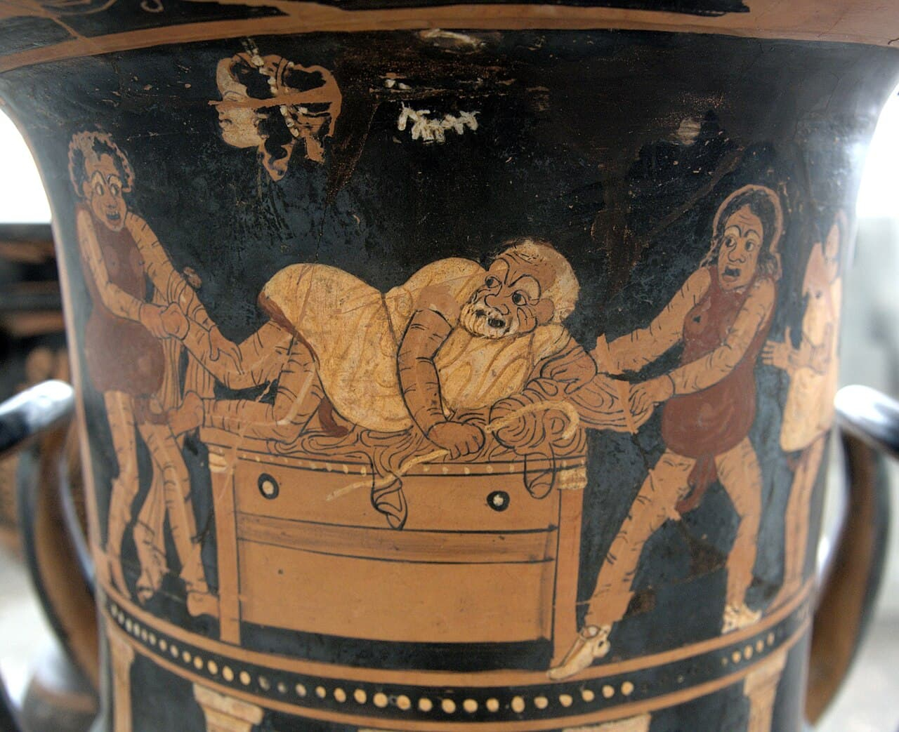 El pintor Pitón es uno de los grandes maestros de la cerámica apulia de finales del siglo IV a. C., junto al Pintor de Darío. Su estilo se distingue por composiciones monumentales, riqueza cromática con abundante uso de colores añadidos —blanco, amarillo, púrpura— y una predilección por los temas teatrales y míticos de gran carga dramática. En esta crátera, el detalle minucioso de las vestiduras, la tensión en los gestos y la organización jerárquica de los personajes convierten la superficie del vaso en una auténtica escena teatral.