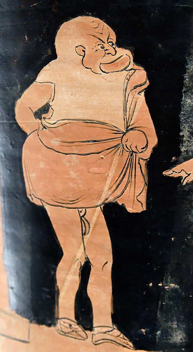 Escena de farsa flíaca en una crátera de Grupo de Lentini-Manfria: esclavo con quitón corto, c. 350-340 a. C. Museo del Louvre. Lentini-Manfria Group – Jastrow (2006). Fuente: Wikipedia. Original file (1,750 × 3,180 pixels, file size: 3.4 MB).