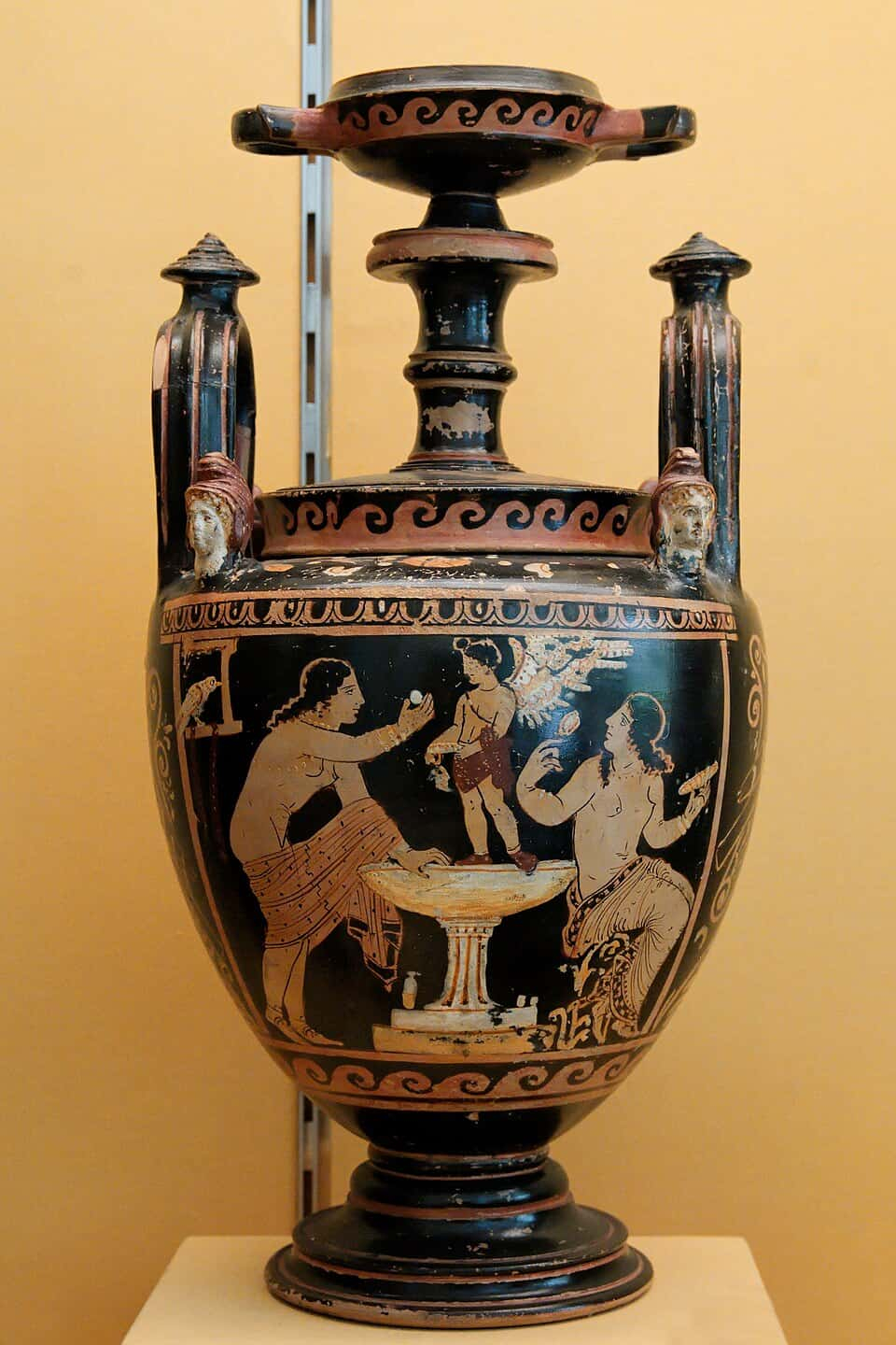 Lebes gámico del pintor Asteas, h. 340 a. C., Museo Arqueológico Nacional, Madrid. Asteas – Marie-Lan Nguyen (User:Jastrow), 2008-05-02. CC BY 2.5. Original file (2,300 × 3,450 pixels, file size: 3.37 MB.).