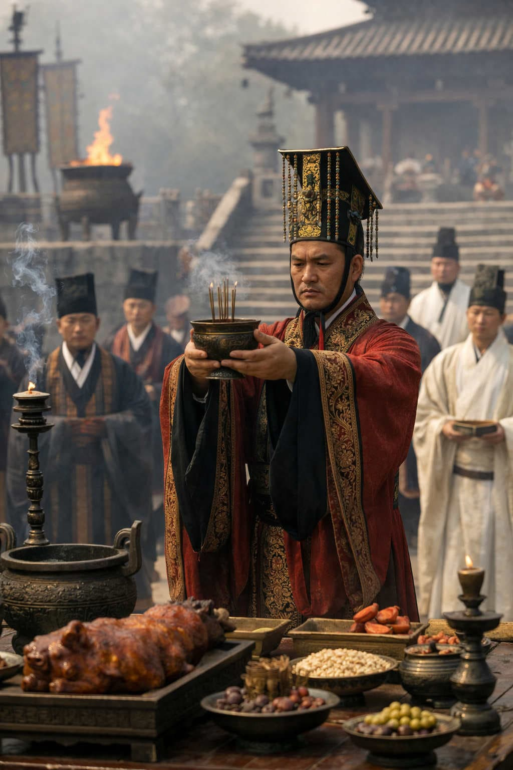 La responsabilidad sagrada tiene también un sentido ritual. En China, el ritual no era un detalle ceremonial, sino una tecnología de orden. El emperador debía realizar sacrificios, respetar calendarios, presidir ceremonias, mantener la música ritual y garantizar que el Estado funcionara como una estructura simbólica coherente. Esto puede parecer secundario desde una mentalidad moderna, pero en el mundo antiguo era fundamental. El ritual era el lenguaje visible de la civilización. Era la forma en que el poder demostraba que existía un centro, que existía jerarquía, que existía armonía. El emperador, como eje del universo político, debía encarnar ese ritual.