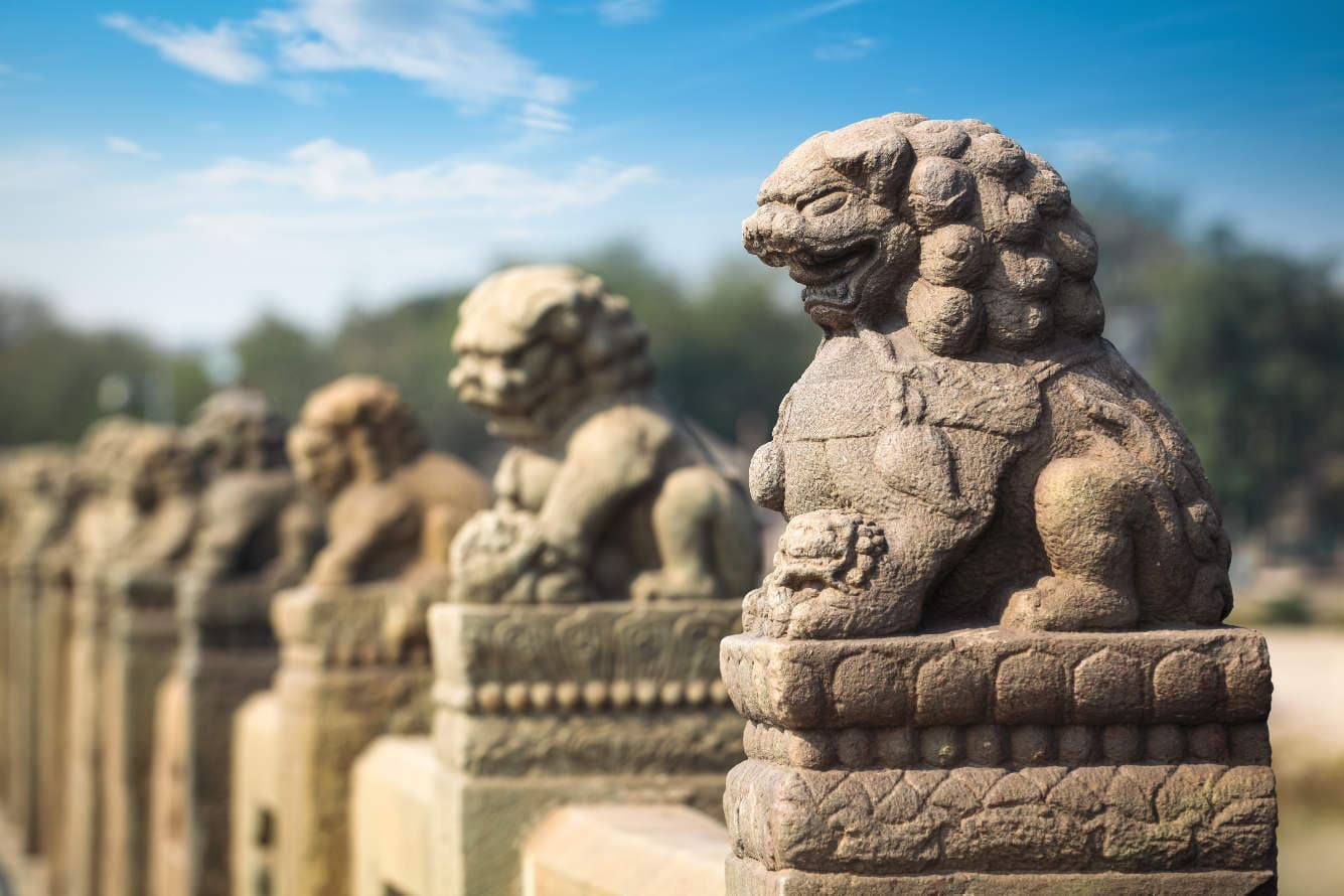León guardián de piedra (shishi), símbolo tradicional de protección y autoridad en la cultura china. — © Chuyu2014. Envato Elements.