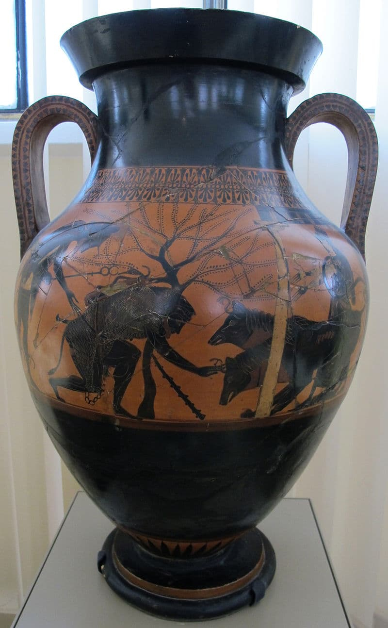 Ánfora ática de figuras negras con Heracles capturando a Cerbero (Duodécimo Trabajo), ámbito del Pintor de Andócides, c. 530–510 a. C. Foto: I, Sailko. CC BY-SA 3.0. Original file (1,632 × 2,640 pixels, file size: 1.89 MB).