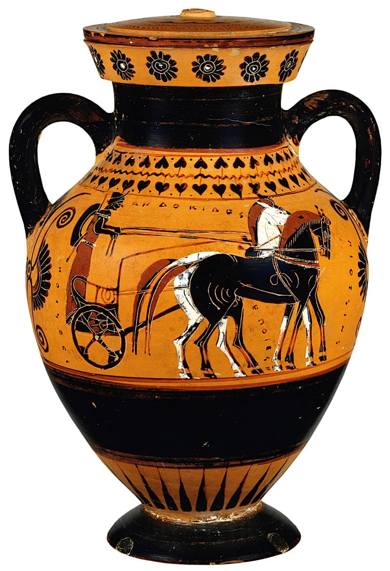 Ánfora de figuras negras con escena de cuadriga. Ática, ca. 550–500 a. C. Museo del Louvre, París. Creator: Andokides. CC0. Original file (2,227 × 3,261 pixels, file size: 556 KB).