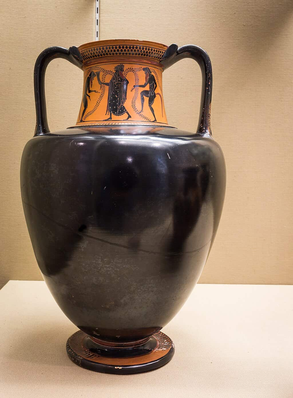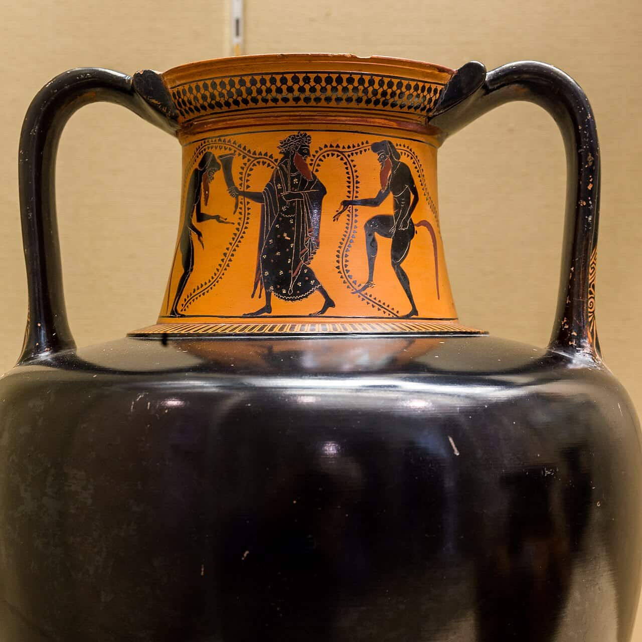 Ánfora de cuello ático de figuras negras con Dioniso entre dos sátiros. Alfarero: Andócides; pintor: Psiax. Atenas, ca. 510 a. C. Procedente de Vulci. British Museum, Londres (inv. 1980,1029.1). Foto: ArchaiOptix. CC BY-SA 4.0. Original file (2,967 × 4,034 pixels, file size: 6.64 MB). Nota: El museo mencionado permite la fotografía de sus piezas con fines privados, educativos, científicos y no comerciales. Si se desea utilizar la imagen con fines comerciales, es necesario contactar previamente con el museo y solicitar permiso.