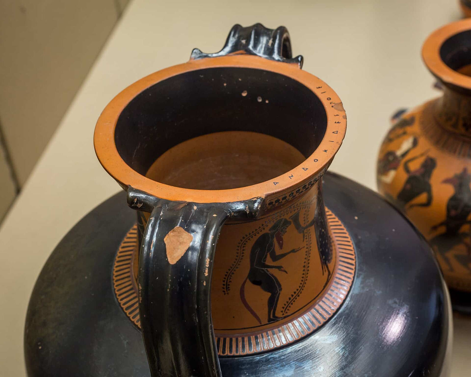 Esta ánfora de cuello ático de figuras negras, producida en Atenas hacia el 510 a. C., es una obra firmada por el alfarero Andócides y atribuida al pintor Psiax, uno de los artistas más innovadores de la época. Se halló en Vulci, una de las necrópolis etruscas más ricas, lo que refleja el interés de los etruscos por la cerámica griega de prestigio. La escena pintada en el cuello muestra a Dioniso, dios del vino y del éxtasis, portando un ritón (vaso para beber o libar) y acompañado por dos sátiros. Estos seres, mitad hombres y mitad cabras, simbolizan el desenfreno, la sensualidad y la naturaleza indómita ligada al culto dionisíaco.